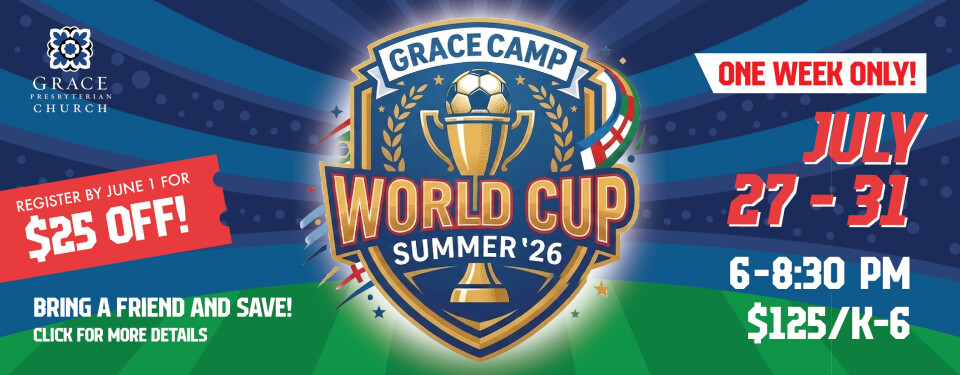 This year’s theme, GraceCamp World Cup, transforms the church into a lively stadium experience where kids will explore sportsmanship, teamwork, and the life-changing message of God’s grace through Jesus Christ. Each evening will feature high-energy soccer skills and games, interactive Bible teaching, music, skits, crafts, and small group time.